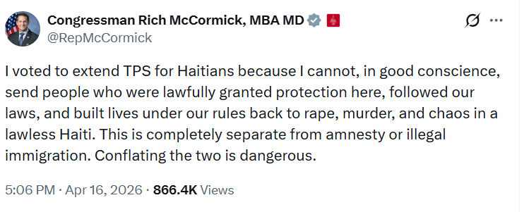 McCormick tried to draw a hard line between TPS and amnesty after the vote, writing on X: I voted to extend TPS for Haitians because I cannot, in good conscience, send people who were lawfully granted protection here, followed our laws, and built lives under our rules back to rape, murder, and chaos in a lawless Haiti. This is completely separate from amnesty or illegal immigration. Conflating the two is dangerous.