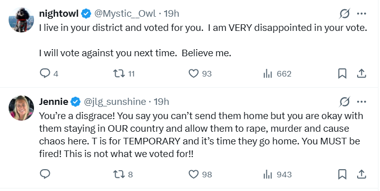 One critic shot back: “Shame on you! 99% of Americans are against TPS for illegals! You work for and are paid for by me and my fellow Americans 😳 You should be fired immediately! Allowing Haitian illegals to remain here indefinitely is dangerous!”