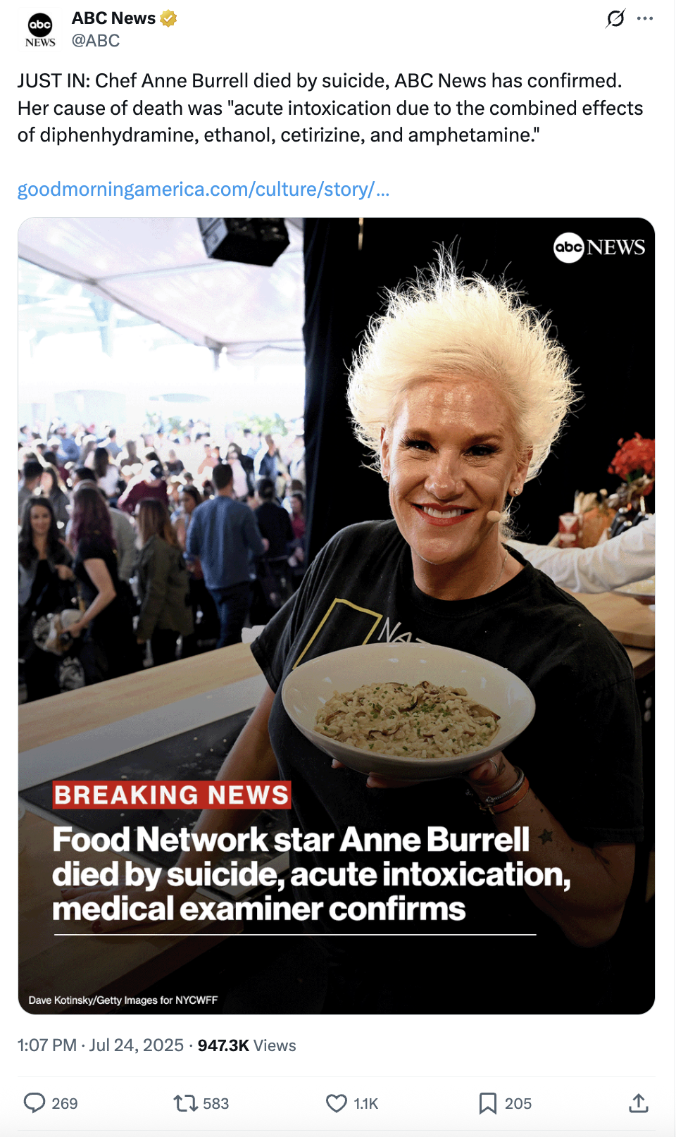 The City of New York Office of Chief Medical Examiner concluded that Burrell died by suicide, citing an “acute intoxication due to the combined effects of diphenhydramine, ethanol, cetirizine, and amphetamine,” according to a statement from the medical examiner to Good Morning America.