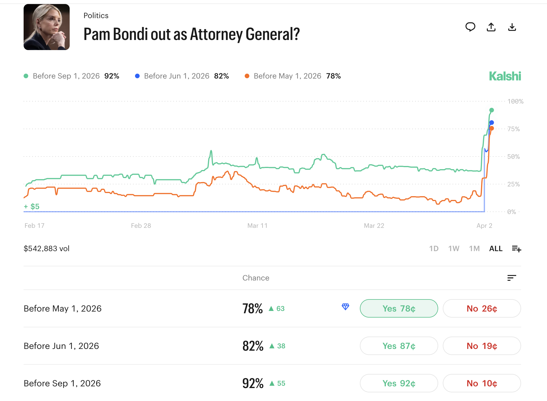 The Kalshi market shows a 78% chance Bondi is gone before May 1, climbing to 82% before June, and a striking 92% before September — a dramatic surge from just days ago, when expectations were far lower.
