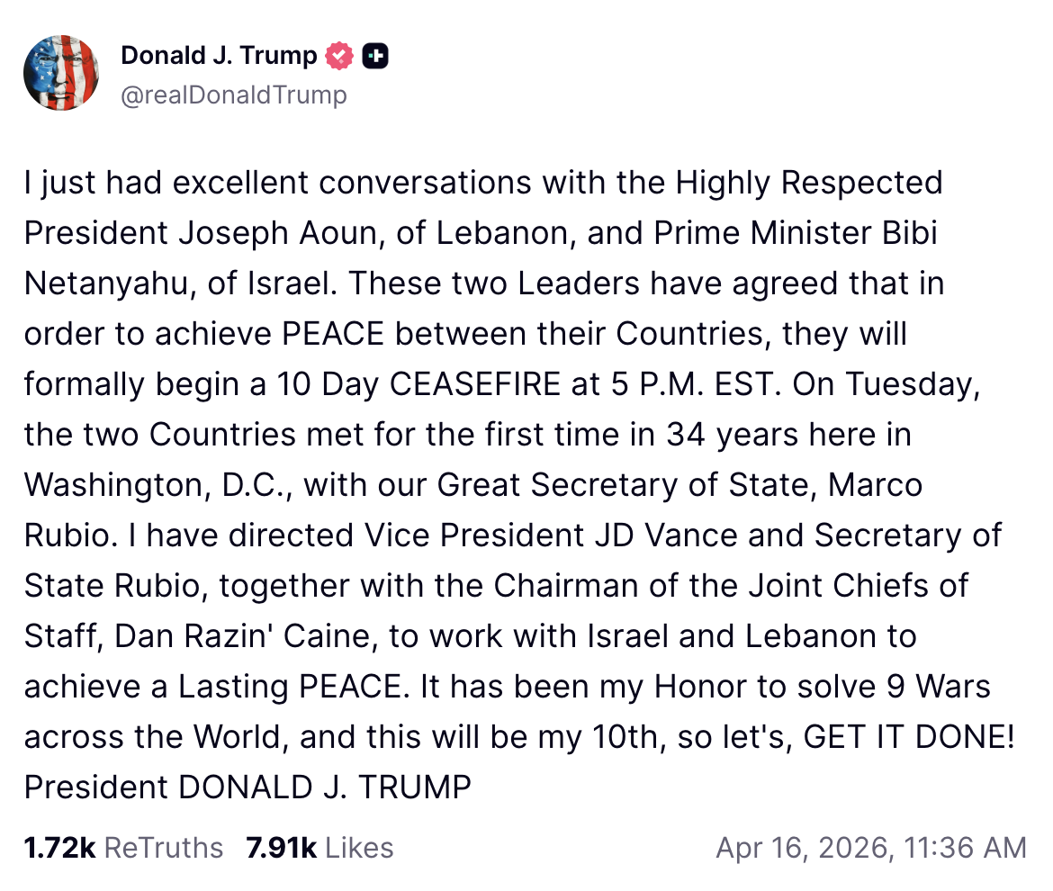 Trump also said Vice President JD Vance, Secretary of State Marco Rubio, and Joint Chiefs Chairman Dan Caine will “work with Israel and Lebanon to achieve a Lasting PEACE,” suggesting the administration is aiming to extend the ceasefire beyond the initial 10-day window.