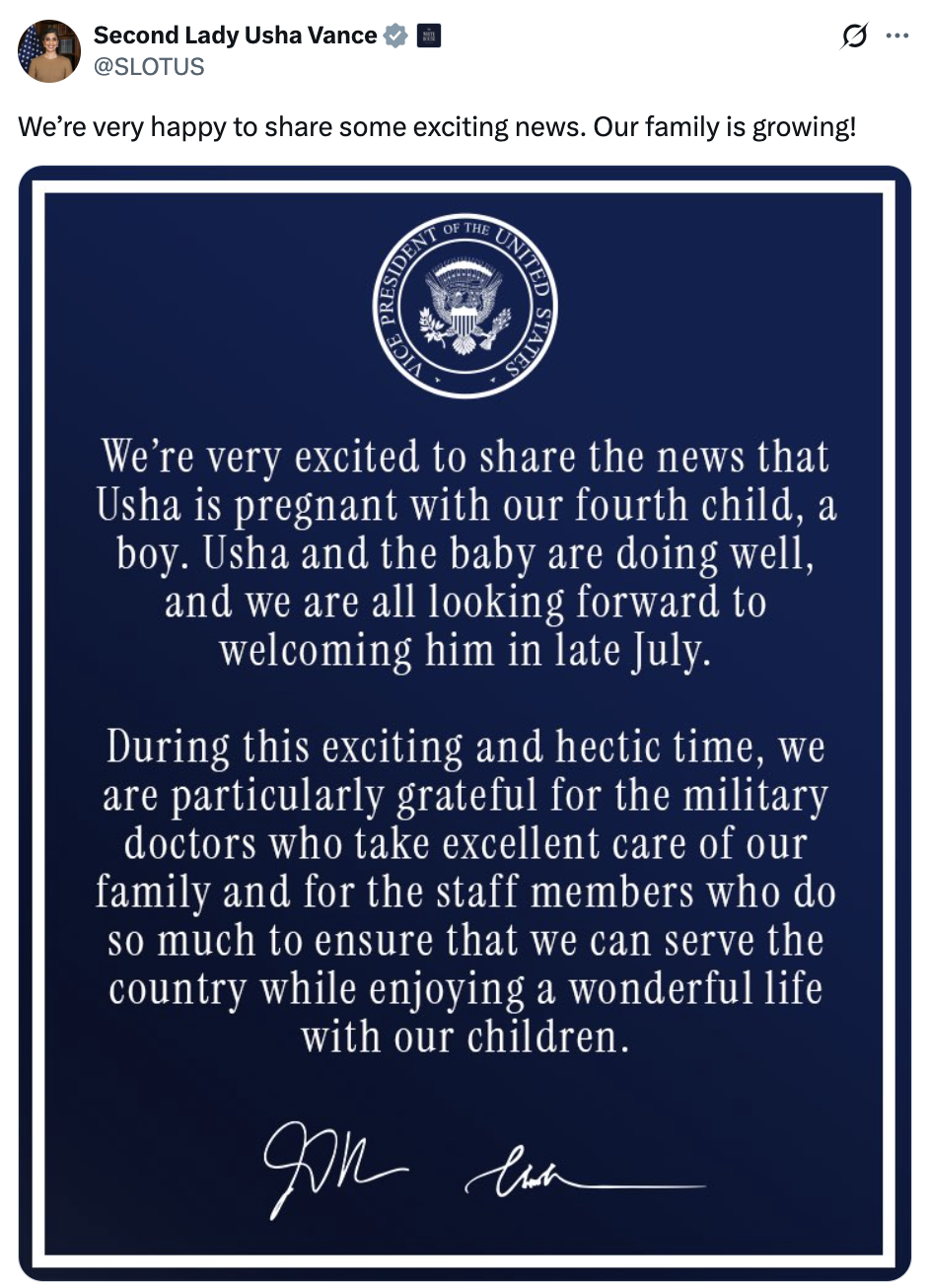 Vice President JD Vance and second lady Usha Vance announced Tuesday that they are expecting their fourth child.