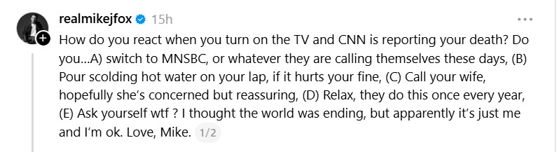 How do you react when you turn on the TV and CNN is reporting your death? Fox wrote. Do you… A) switch to MSNBC, or whatever they are calling themselves these days, (B) Pour scolding hot water on your lap, if it hurts your fine, (C) Call your wife, hopefully she’s concerned but reassuring, (D) Relax, they do this once every year, (E) Ask yourself wtf?