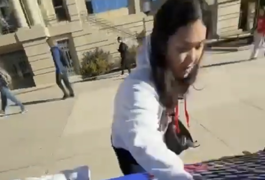 WATCH: A teacher assistant at Illinois State University flipped over a @tpusastudents table and tore down flyers promoting an upcoming @alexstein99 event.