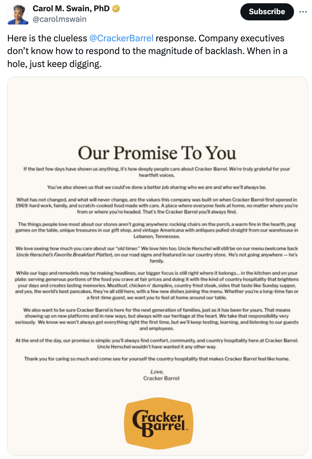 Dr. Carol Swain, an author and political commentator, quoted the statement, writing on X, “Here is the clueless @CrackerBarrel response. Company executives don’t know how to respond to the magnitude of [the] backlash. When in a hole, just keep digging.”