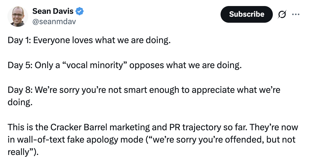 The Federalist founder and CEO Sean Davis wrote, “Day 1: Everyone loves what we are doing. Day 5: Only a ‘vocal minority’ opposes what we are doing. Day 8: We’re sorry you’re not smart enough to appreciate what we’re doing. This is the Cracker Barrel marketing and PR trajectory so far. They’re now in wall-of-text fake apology mode (‘we’re sorry you’re offended, but not really’).”