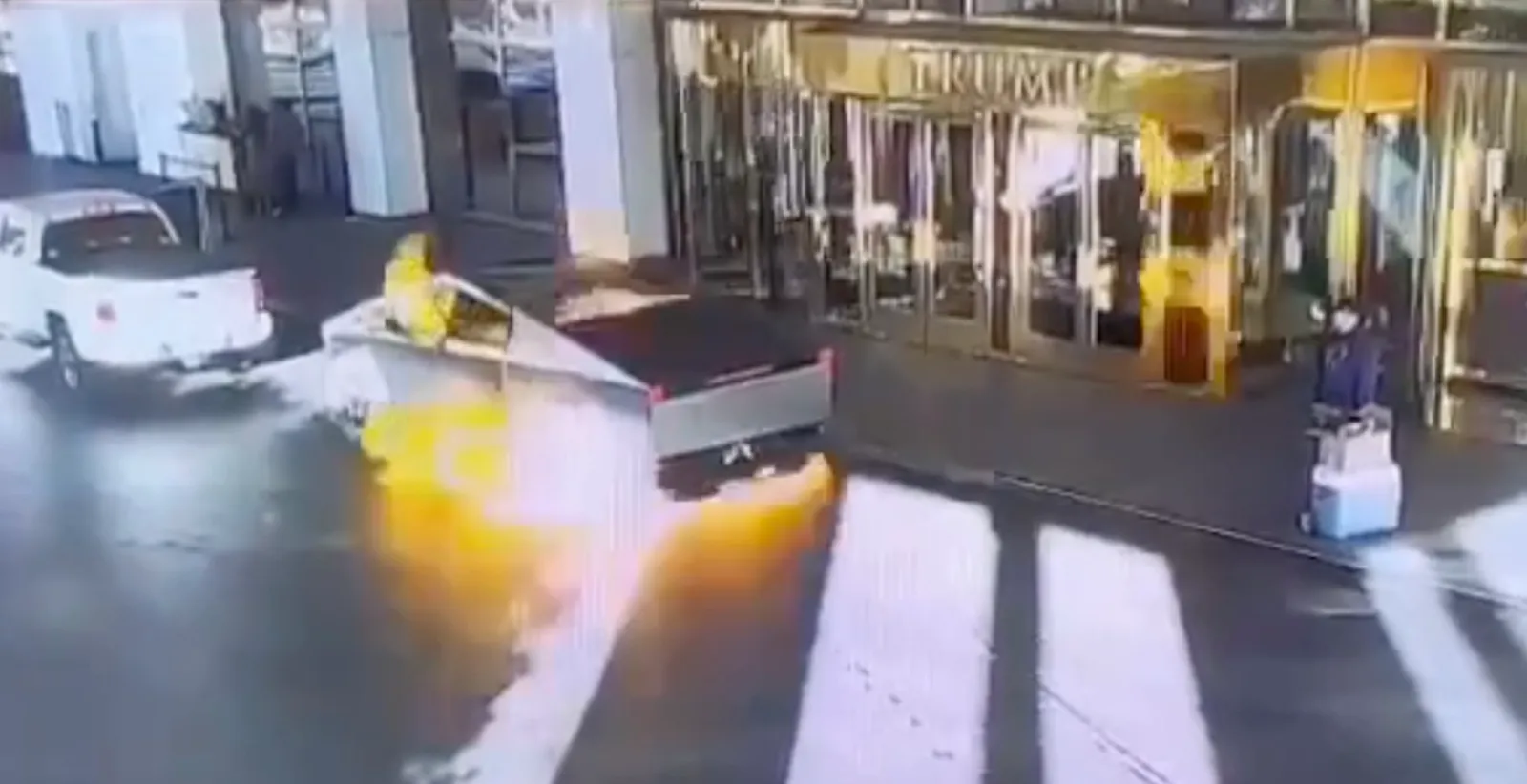 Officials have confirmed that Clark County firefighters responded to a vehicle fire outside Trump’s hotel just before 9 a.m. local time. Footage from the inside the lobby shows the vehicle — which was parked just outside the building’s main entranceway — completely engulfed in flames. Loud pops could also be heard coming from the vehicle as it burns, while an additional angle captured the moment the vehicle exploded with significant force.