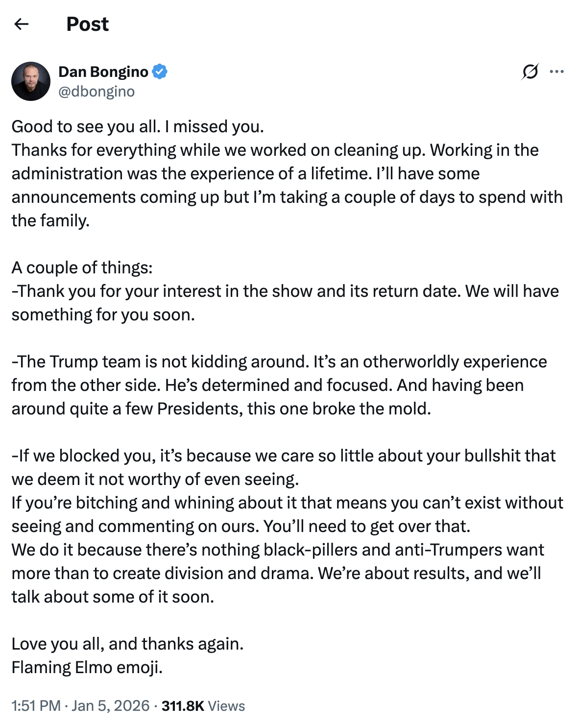 Soon after, Bongino returned to X with a lengthy message to supporters, making clear he has not disappeared for good and that announcements are coming.