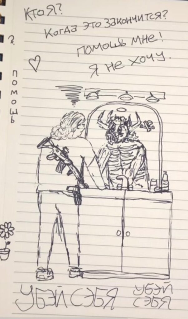 The journal entry shows what appears to be a drawing armed with a rifle and a handgun while talking to a horned figure in the mirror. It also contained a message, seemingly a conversation between Westman and the figure, written in Russian Cyrillic with English words.
