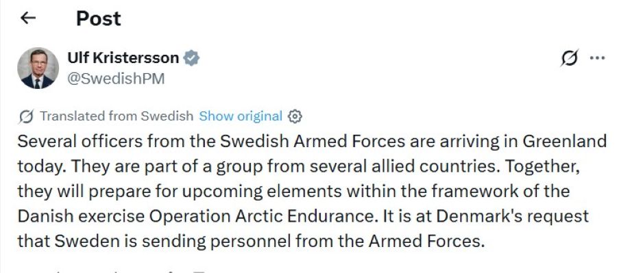 Swedish Prime Minister Ulf Kristersson confirmed his country’s role, writing on X that “some officers from the Swedish Armed Forces are arriving in Greenland today” as part of a multinational team supporting Denmark’s Operation Arctic Endurance.
