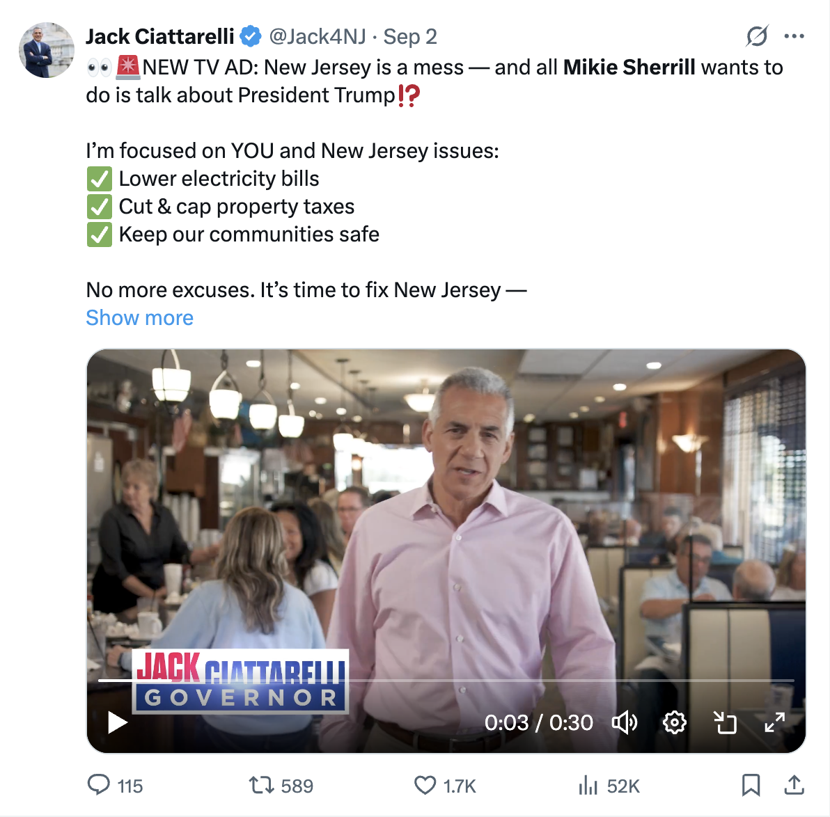 In contrast, Ciattarelli has focused on immediate cost-of-living issues, promising in his latest ad to utilize executive powers to lower energy bills and reduce property taxes.