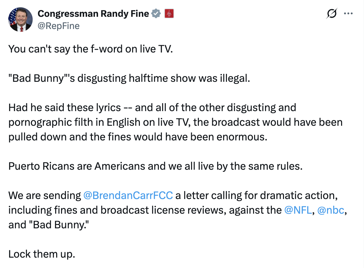 Rep. Randy Fine is demanding federal punishment for the NFL and NBC after what he called an explicit and unlawful Super Bowl halftime show.