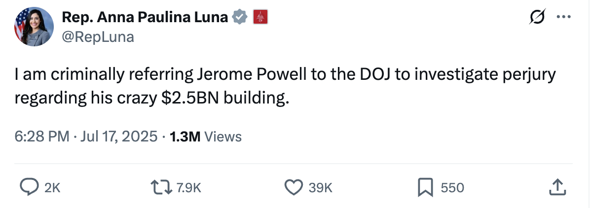 “I am criminally referring Jerome Powell to the DOJ to investigate perjury regarding his crazy $2.5BN building,” Luna wrote in a social media post that has already racked up 1.3 million views.
