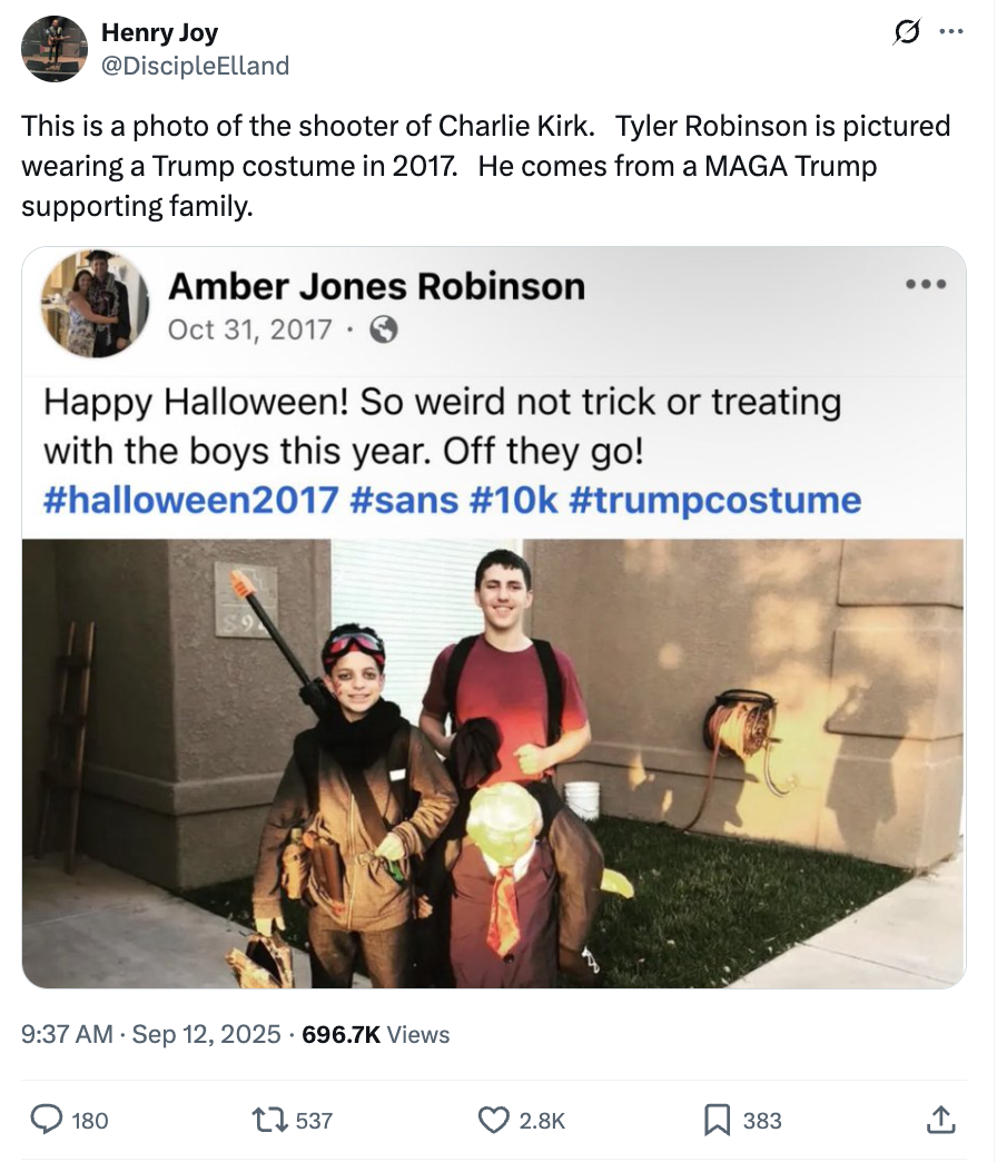 Family photos online show Robinson in 2017 dressed in a Trump-related costume, then one year into his first administration. The discovery was made in the profile of Amber Robinson, his mother, and shows Robinson with a beaming smile as he stands next to his young brother.