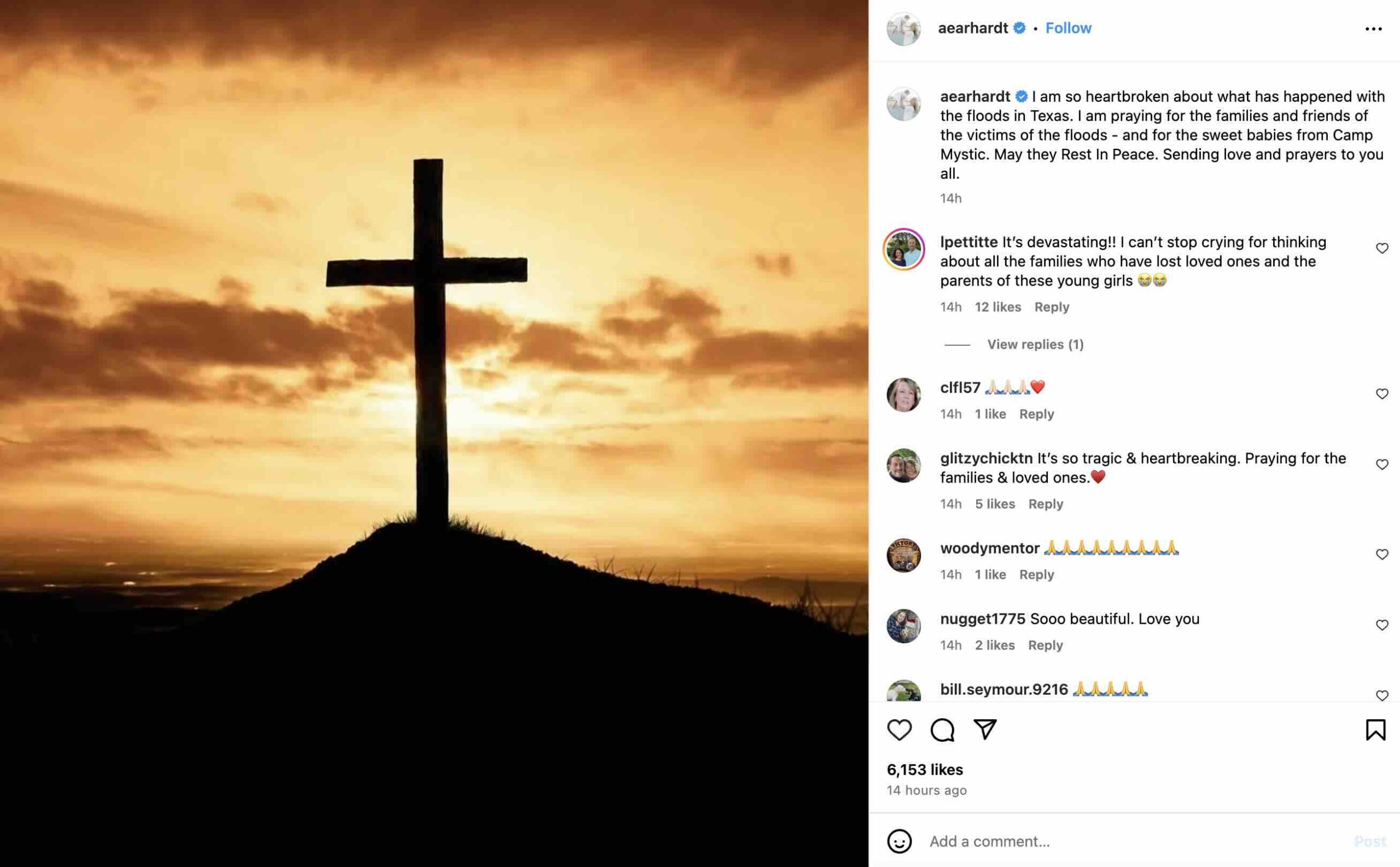 “I am so heartbroken about what has happened with the floods in Texas,” she wrote on Instagram, sharing a photo of a cross on a hill.