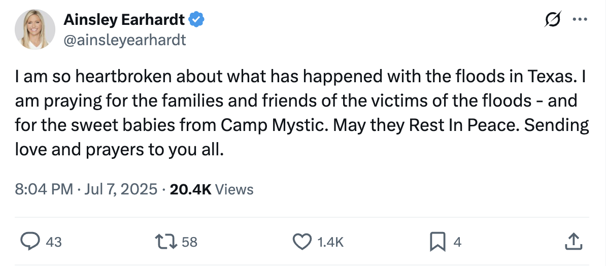“This is so sad Ainsley. My friends from high school went to Camp Mystic in the summer back when they were kids. Praying for all the families affected by this tragedy,” she wrote back.