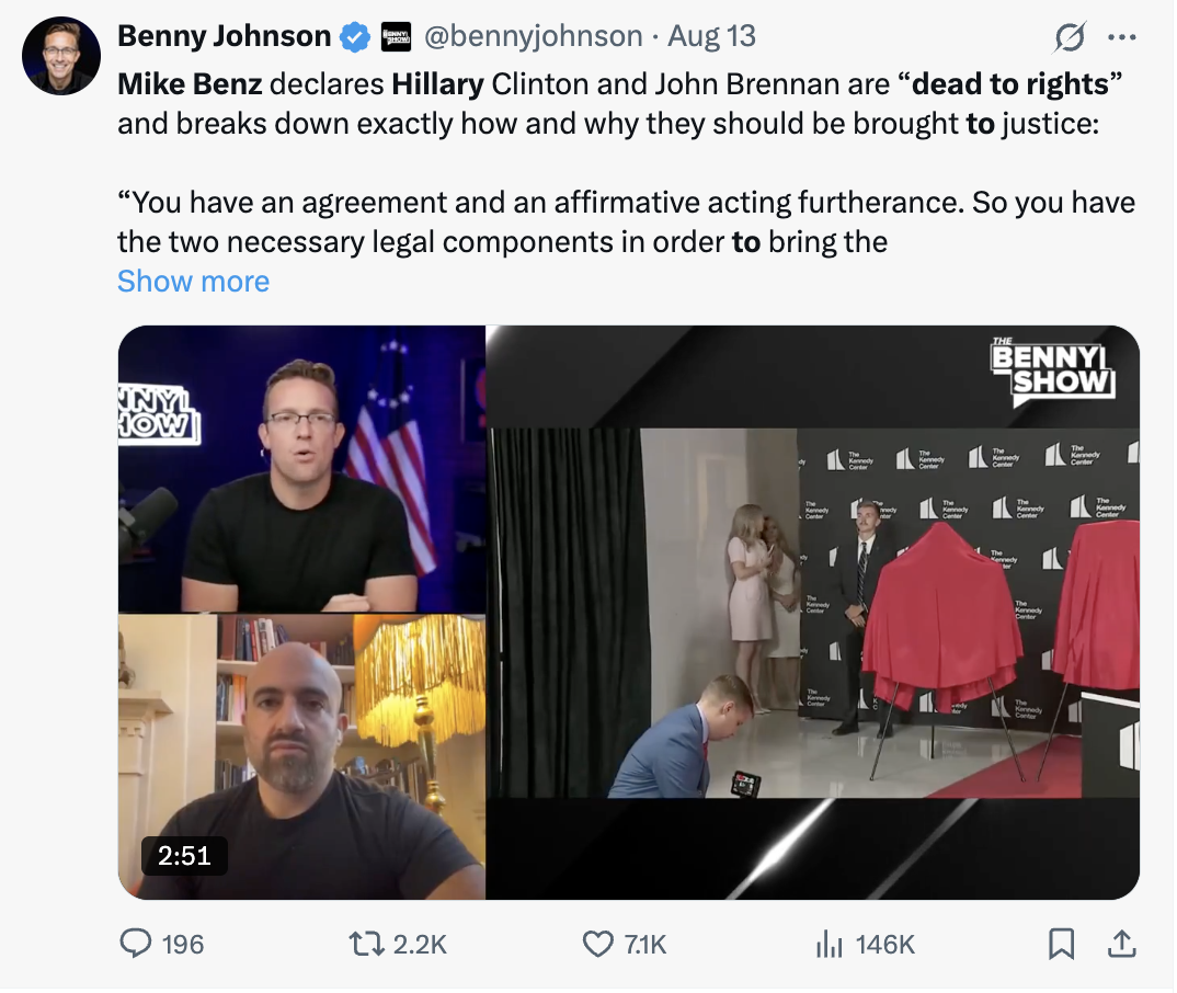 Speaking with conservative influencer Benny Johnson, Benz laid out how the former presidential candidate and ex-CIA director are implicated in a so-called cover-up that baselessly tied Trump to Russian forces during the election that year. The administration is believed to be readying charges against Clinton, Brennan, and a host of high-level officials from that time.