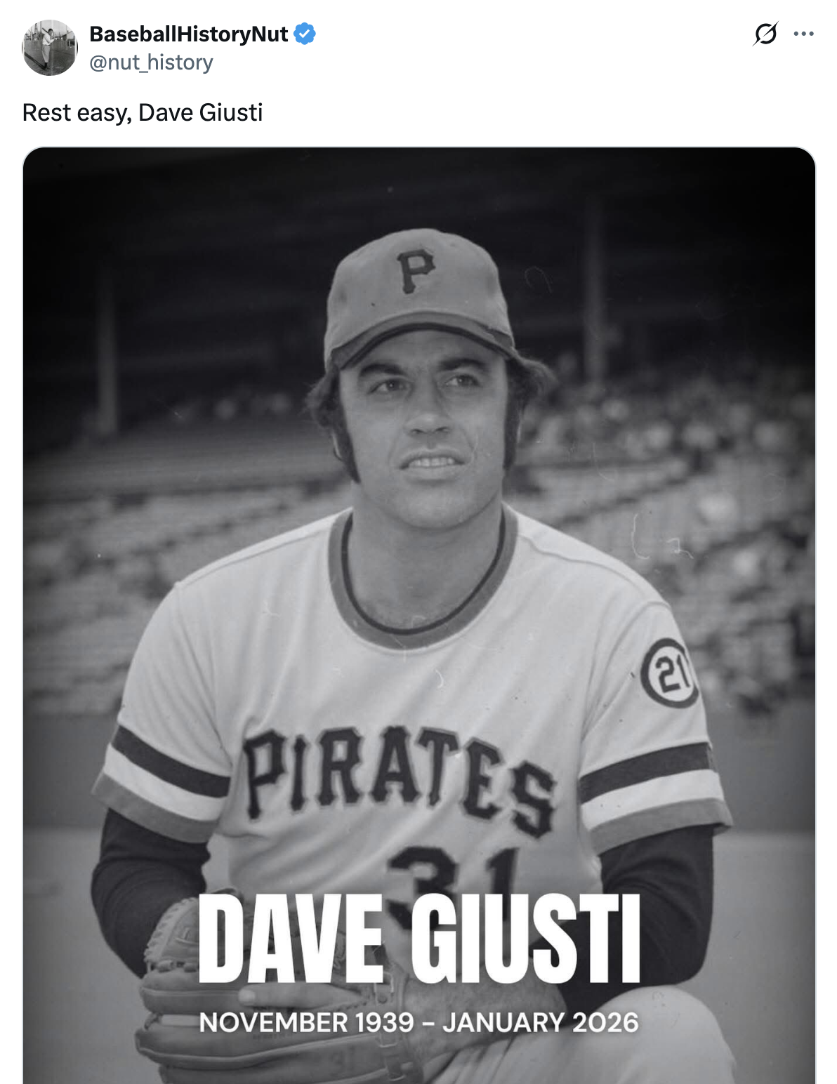The Pirates said Dave Giusti died Sunday, citing his family. He was 86.