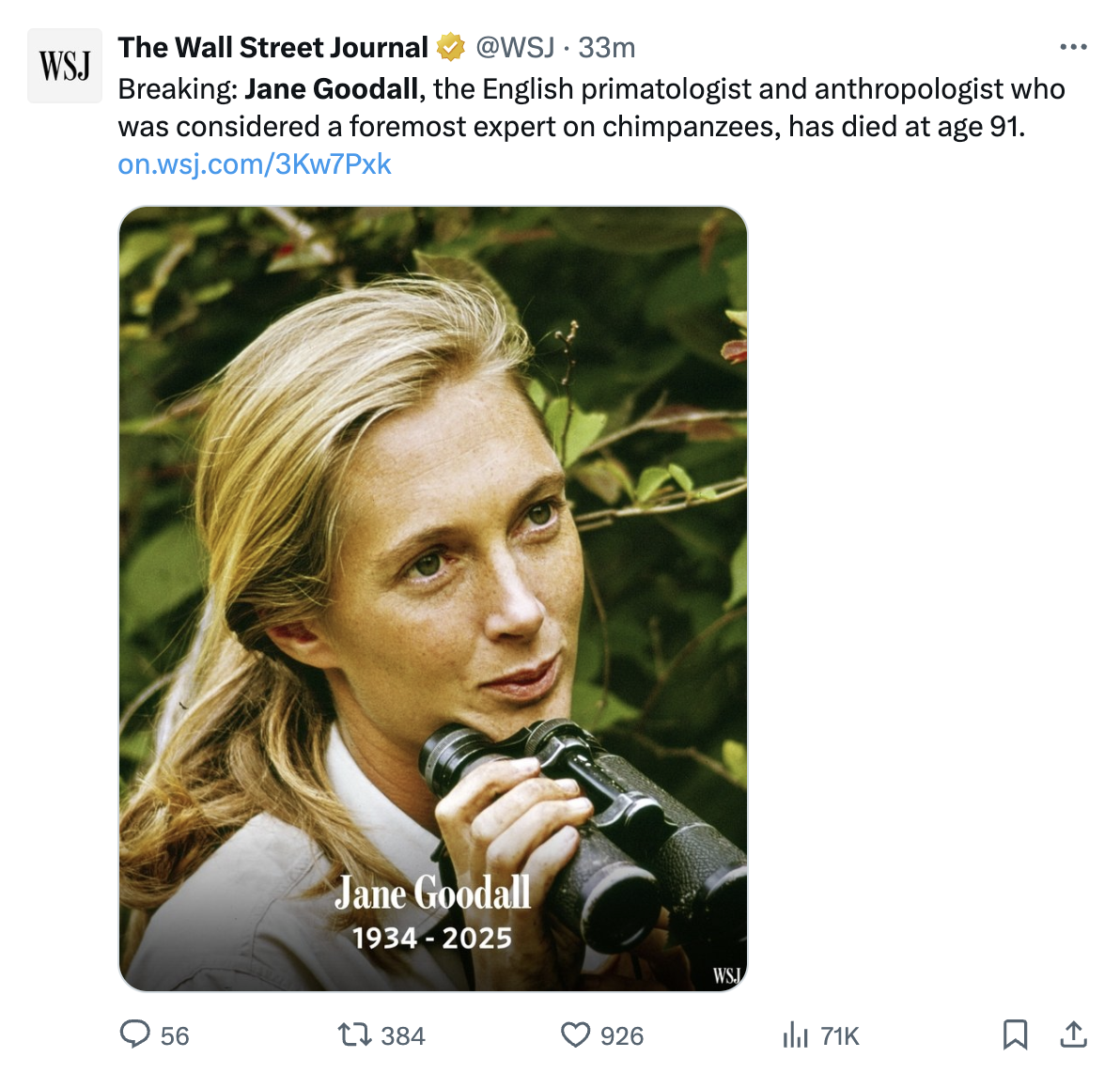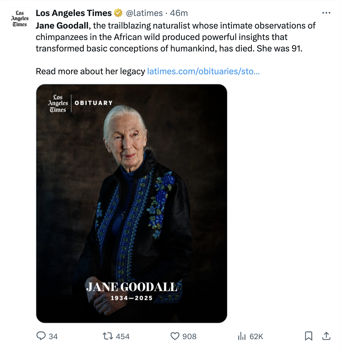“Dr. Goodall’s discoveries as an ethologist revolutionized science, and she was a tireless advocate for the protection and restoration of our natural world,” the organization said in statement on social media.