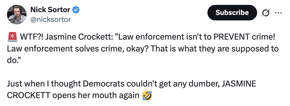 “WTF?! Jasmine Crockett: ‘Law enforcement isn’t to PREVENT crime! Law enforcement solves crime, okay? That is what they are supposed to do.’ Just when I thought Democrats couldn’t get any dumber, JASMINE CROCKETT opens her mouth again,” conservative journalist Nick Sorter wrote on X.