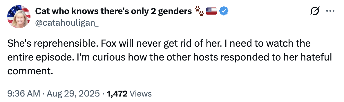 “She’s reprehensible. Fox will never get rid of her,” they wrote.
