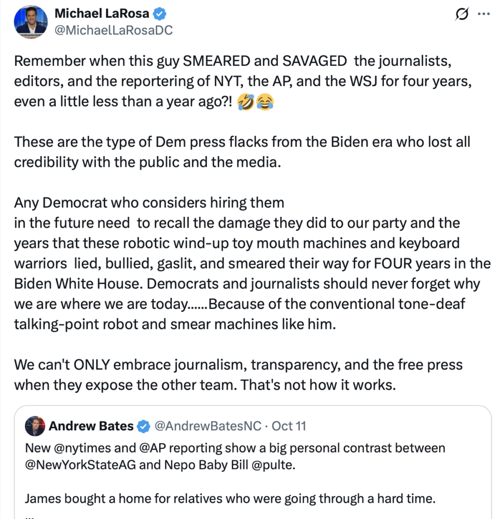 “Remember when this guy SMEARED and SAVAGED the journalists, editors, and the reportering of NYT, the AP, and the WSJ for four years, even a little less than a year ago?!” LaRosa wrote. “These are the type of Dem press flacks from the Biden era who lost all credibility with the public and the media,” he added.