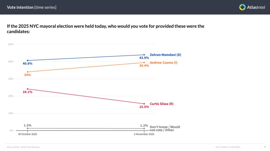 The AtlasIntel survey, published Monday afternoon, puts Mamdani at 43.9% and Cuomo nipping at his heels with 39.4%. GOP contender Curtis Sliwa trails at 15.5%, while just over 1% of voters say they’re undecided or staying home.