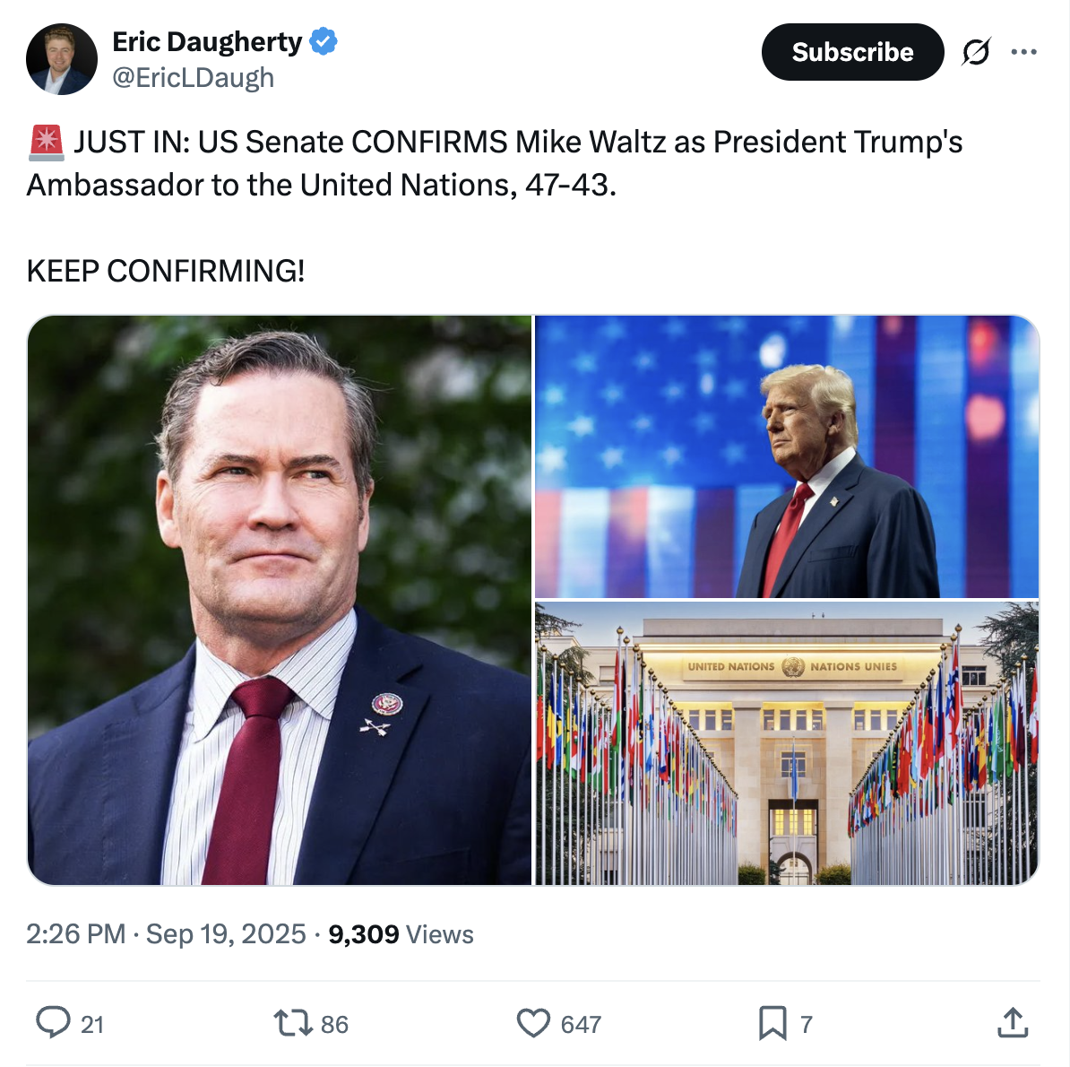 Confirmation will allow Waltz to attend next week’s U.N. General Assembly in New York, where President Trump is expected to deliver remarks.