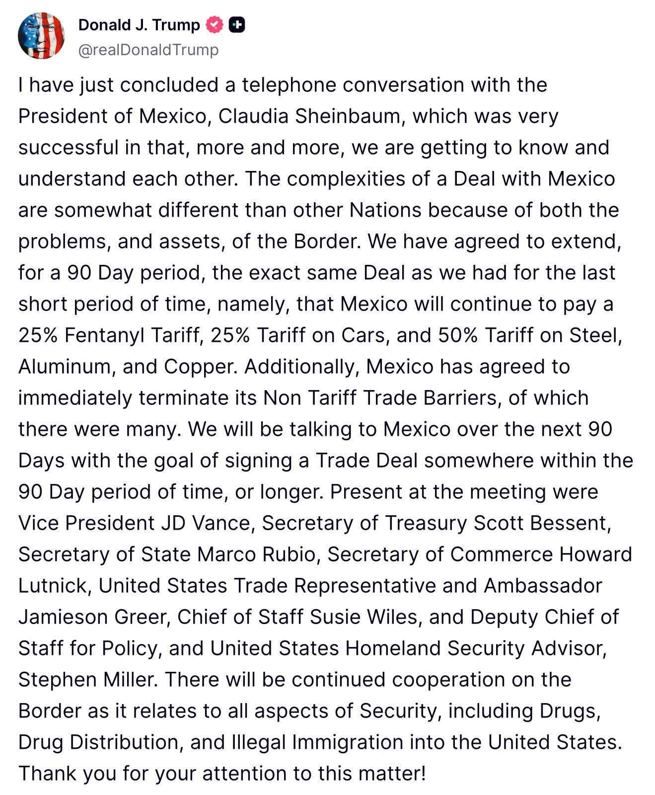 “There will be continued cooperation on the Border as it relates to all aspects of Security, including Drugs, Drug Distribution, and Illegal Immigration into the United States,” Trump concluded.