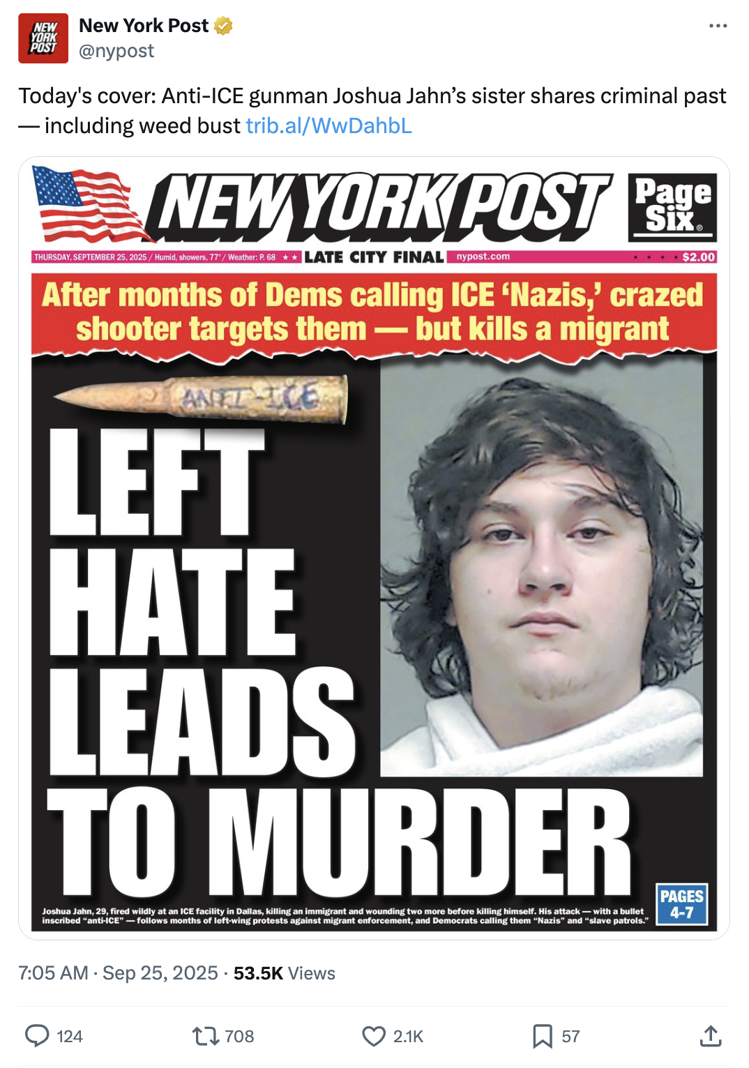 Jahn’s brother fired a hellish series of rifle rounds at an ICE detention center in Dallas, killing one illegal immigrant and wounding two others as officers were bringing in a busload for processing. Police surrounded Jahn on a nearby rooftop, where he shot himself in the head with a hunting rifle similar to the one used to kill Charlie Kirk earlier this month.