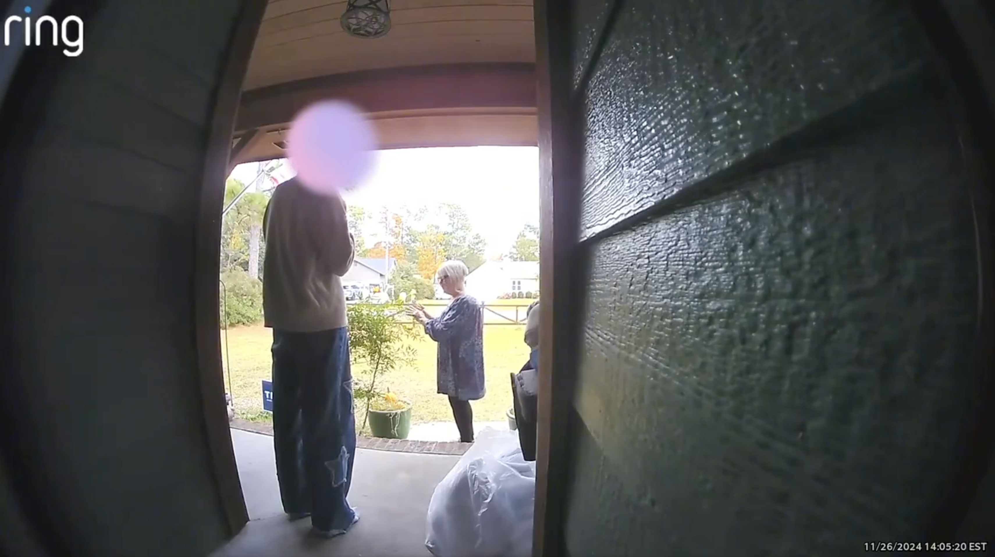The Ring doorbell camera shows an elderly woman walking up to the front porch of a home in North Carolina where she was greeted by the homeowner. The End Wokeness account on X, which obtained the footage, drew viewers to negative remarks made by the woman shortly after she delivered a children’s mattress to the resident.