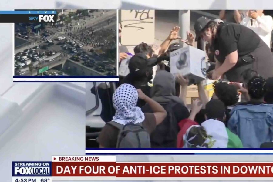 The moment of realization dawned on anchors and a correspondent with KTTV in L.A. while watching activists arrive in a pickup truck and unload boxes of what they originally suspected were groceries or other peaceful contributions to the fourth day of demonstrations. However, the mood quickly turned dark when the group of newscasters saw markings on the dozens of boxes being handed out into the crowd.