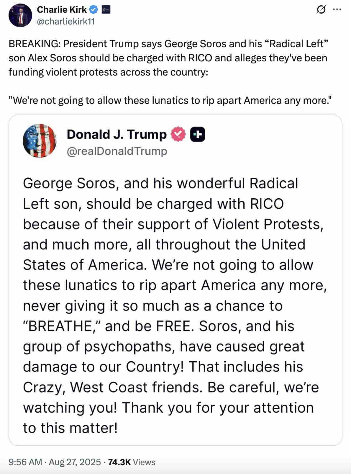 “George Soros, and his wonderful Radical Left son, should be charged with RICO because of their support of Violent Protests, and much more, all throughout the United States of America,” Trump wrote on Truth Social Tuesday morning.