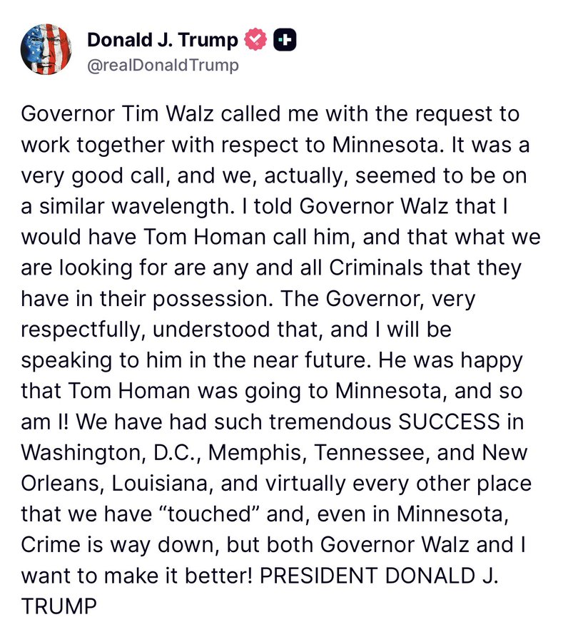 “Governor Tim Walz called me with the request to work together with respect to Minnesota,” the president wrote. “It was a very good call, and we, actually, seemed to be on a similar wavelength. I told Governor Walz that I would have Tom Homan call him, and that what we are looking for are any and all Criminals that they have in their possession,” Trump wrote.
