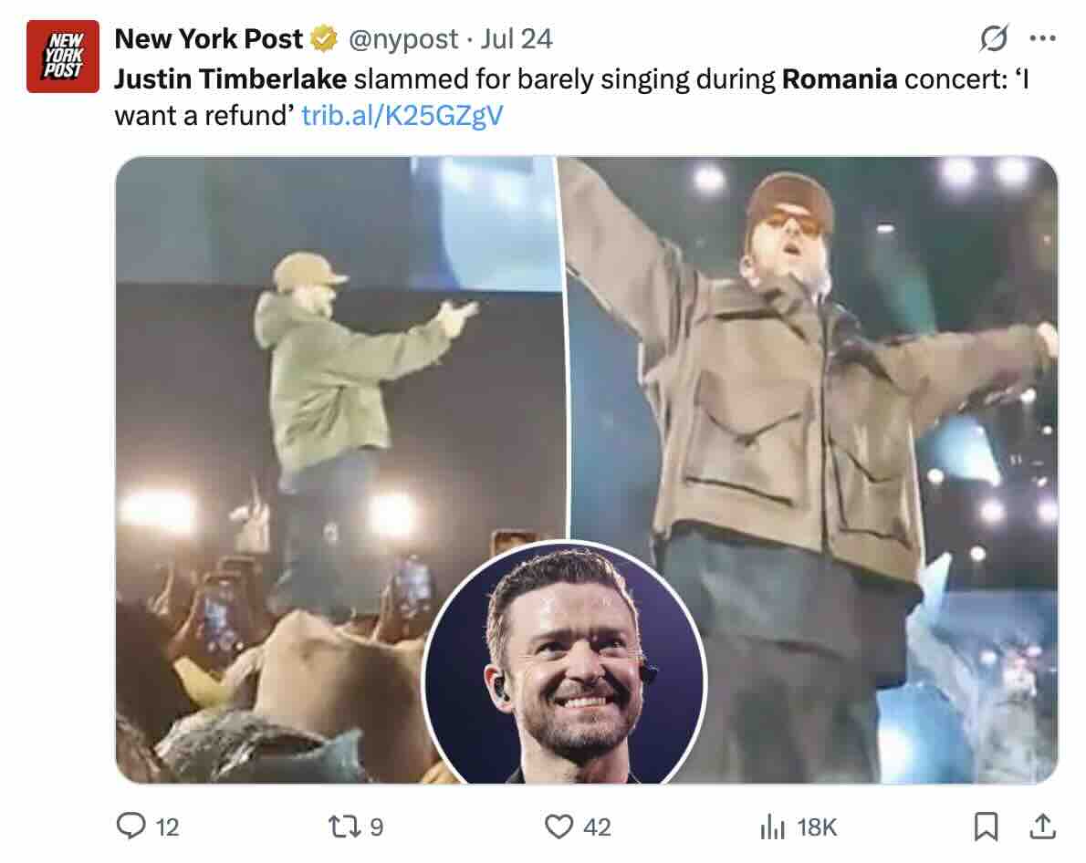 Attendees at Romania’s Electric Castle festival saw Timberlake strolling back and forth on stage, urging audience members to clap their hands while his tracks played with no vocals.