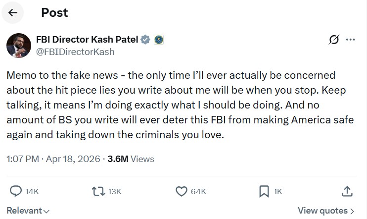 Patel’s lawsuit targets The Atlantic and staff writer Sarah Fitzpatrick, blasting the article as “a sweeping, malicious, and defamatory hit piece published on April 17, 2026.”