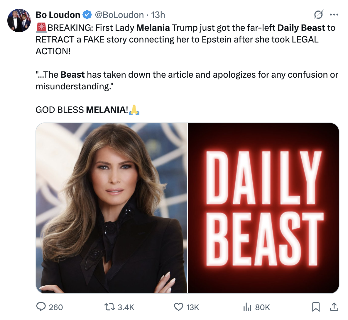 “After this story was published, The Beast received a letter from First Lady Melania Trump’s attorney challenging the headline and framing of the article,” read the editor’s note.