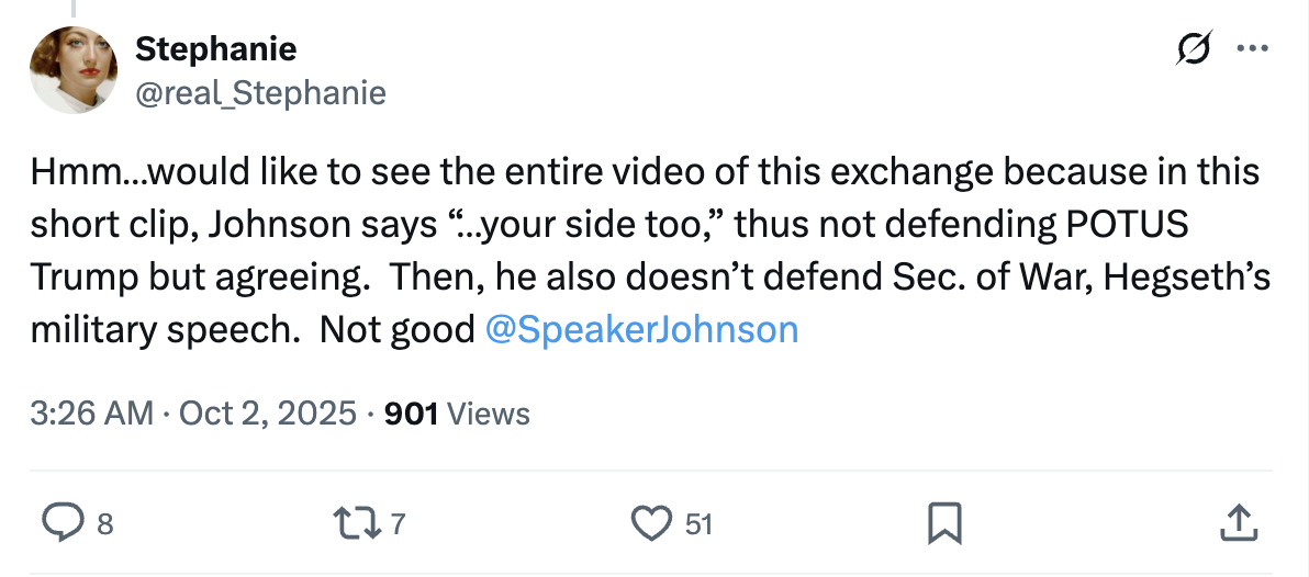 “Johnson says ‘…your side too,’ thus not defending POTUS Trump but agreeing. Then, he also doesn’t defend Sec. of War, Hegseth’s military speech. Not good,” the user reacted.