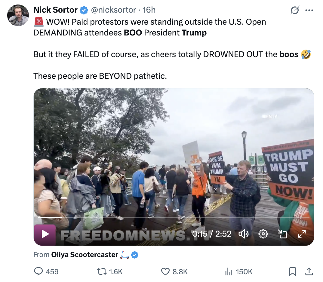 Video of Trump’s appearance first appeared on Bluesky, the left’s alternative to X, and shows Trump waving to a sparse audience before the start of a match. Almost no crowd reaction could be heard.