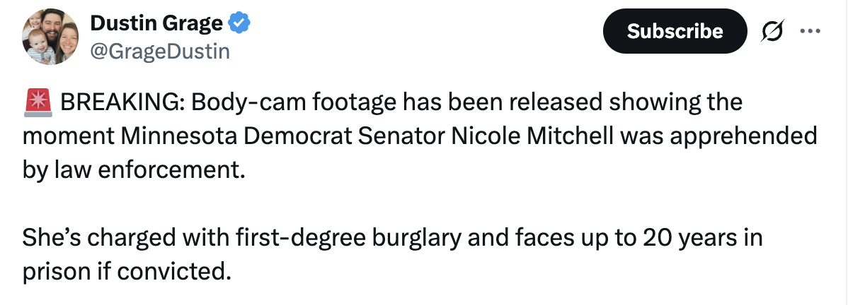 Minnesota Democrat Senator Nicole Mitchell faces up to 20 years in prison on charges of burglary stemming from a break-in that police officers responded to at her stepmother’s home on April 22, 2024.