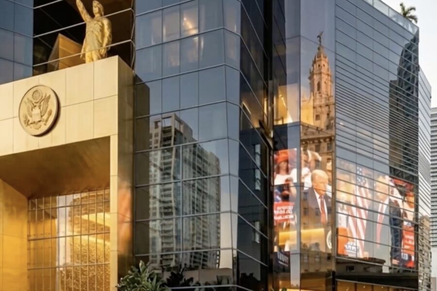 The nearly two-minute clip shows a towering, modern structure looming over downtown Miami, with dramatic shots of a gold-toned entrance, a presidential seal, and a statue out front. Inside, the plans appear to include recreations of the Oval Office and the controversial East Wing ballroom Trump has been building at the White House. Air Force One features prominently throughout the video.