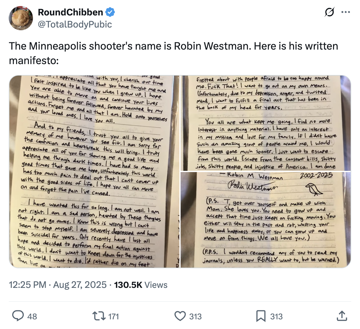 Robin Westman, the alleged transgender individual implicated by unconfirmed online reports in Wednesday’s shooting of a Catholic church in Minneapolis, appears to have made social media posts in his final days that suggest he was targeting churchgoers out of a hatred for their faith.