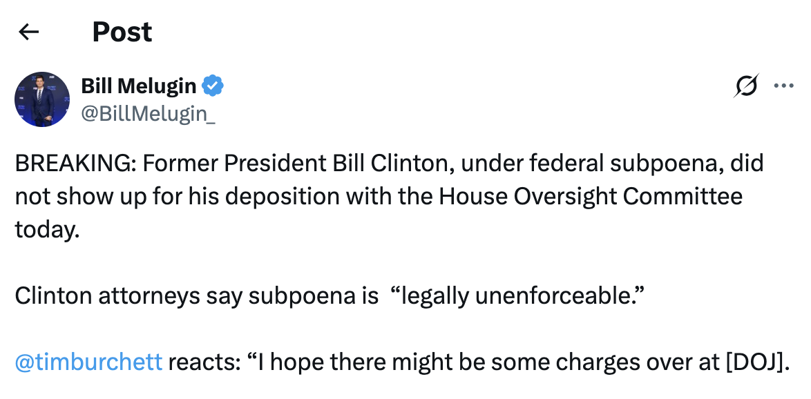 The Hill reached out to a spokesperson and an attorney for the Clintons, but neither responded immediately on Tuesday morning.