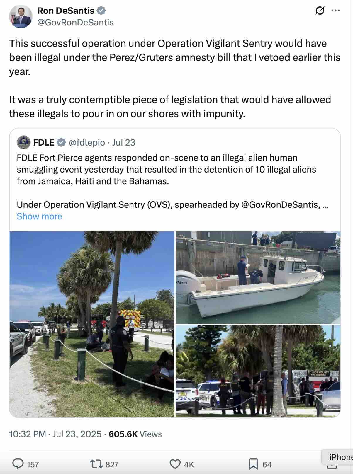 “It was a truly contemptible piece of legislation that would have allowed these illegals to pour in on our shores with impunity,” DeSantis said after local authorities disrupted a human trafficking ring.