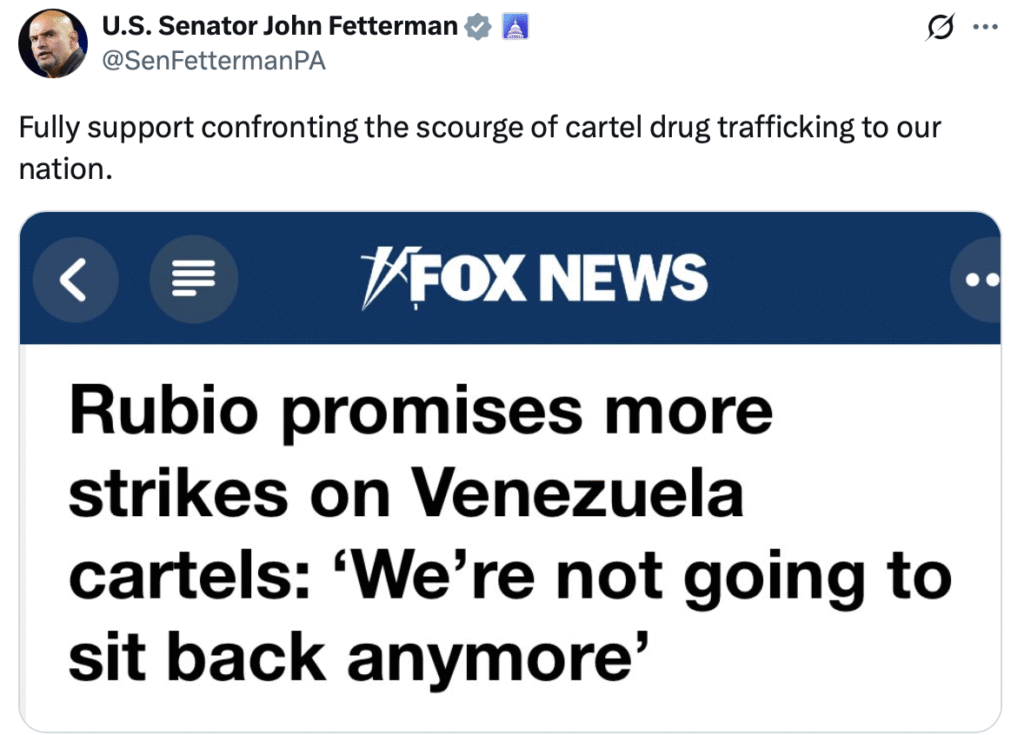 Secretary of State Marco Rubio announced Wednesday strikes against Venezuelan drug-trafficking organizations — which have been designated as terrorist organizations — will continue. The news was met with support from Senator John Fetterman (D-PA), who wrote, “Fully support confronting the scourge of cartel drug trafficking to our nation,” in response to the secretary’s statement.
