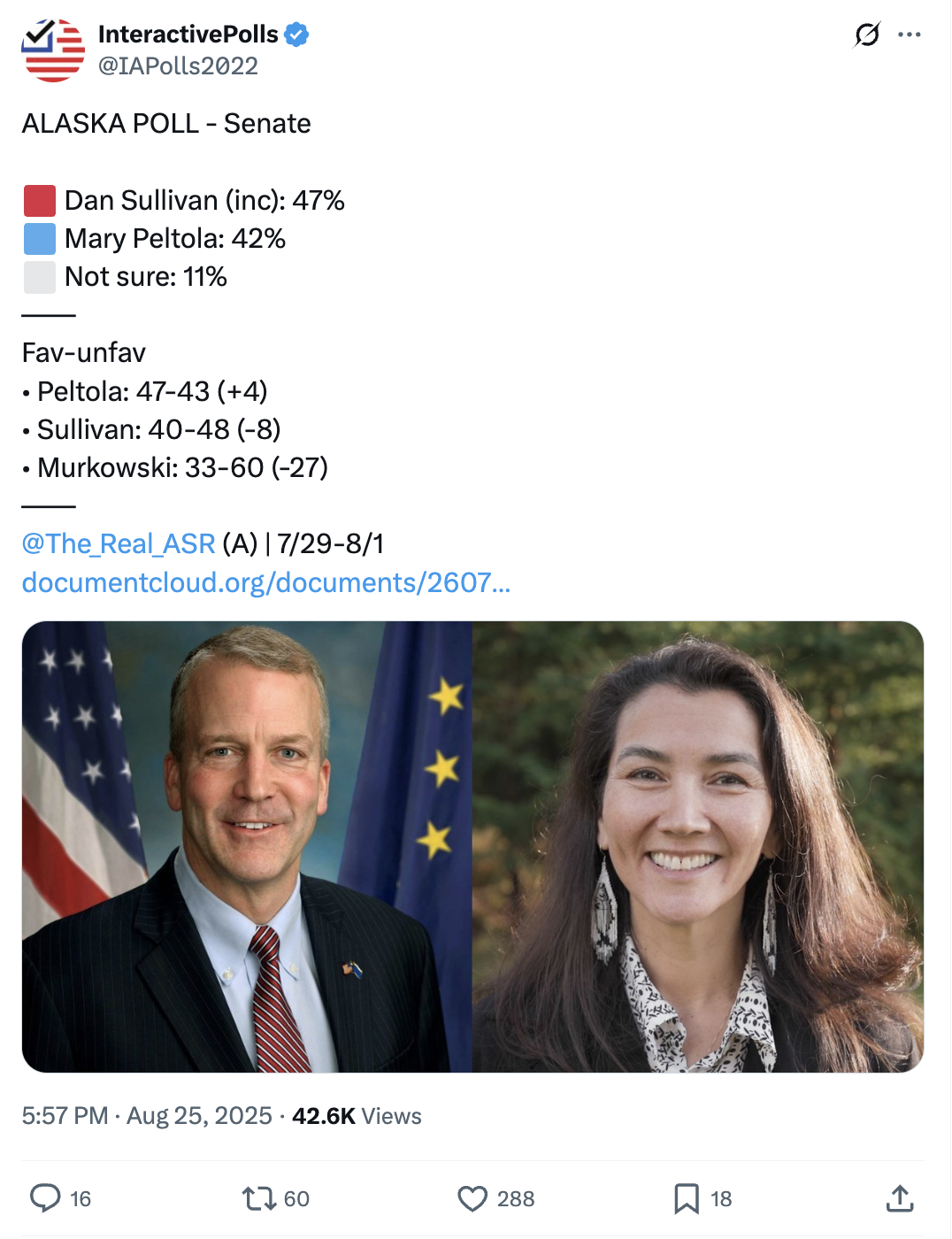 If the election were held today, Sullivan would lead Peltola 47%-42%, with 11% undecided. Sen. Lisa Murkowski (R-AK), who is not up for reelection until 2028, faces a dismal 33% approval rating compared to 60% of Alaskans who disapprove of the senior Republican.
