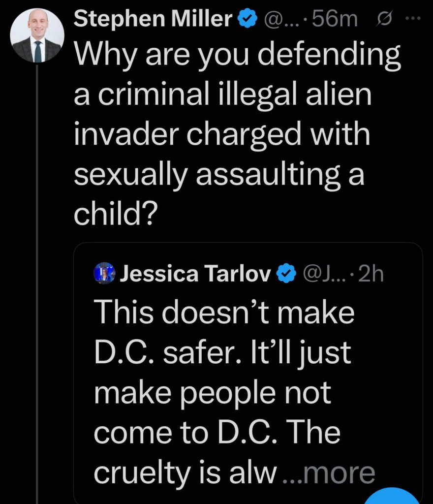 White House Deputy Chief of Staff Stephen Miller also weighed in on the controversy in a post of his own. “Why are you defending a criminal illegal alien invader charged with sexually assaulting a child?” Miller wrote.
