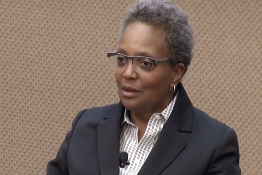 Then-Chicago Mayor Lori Lightfoot speaks at the MacLean Center on April 24, 2018