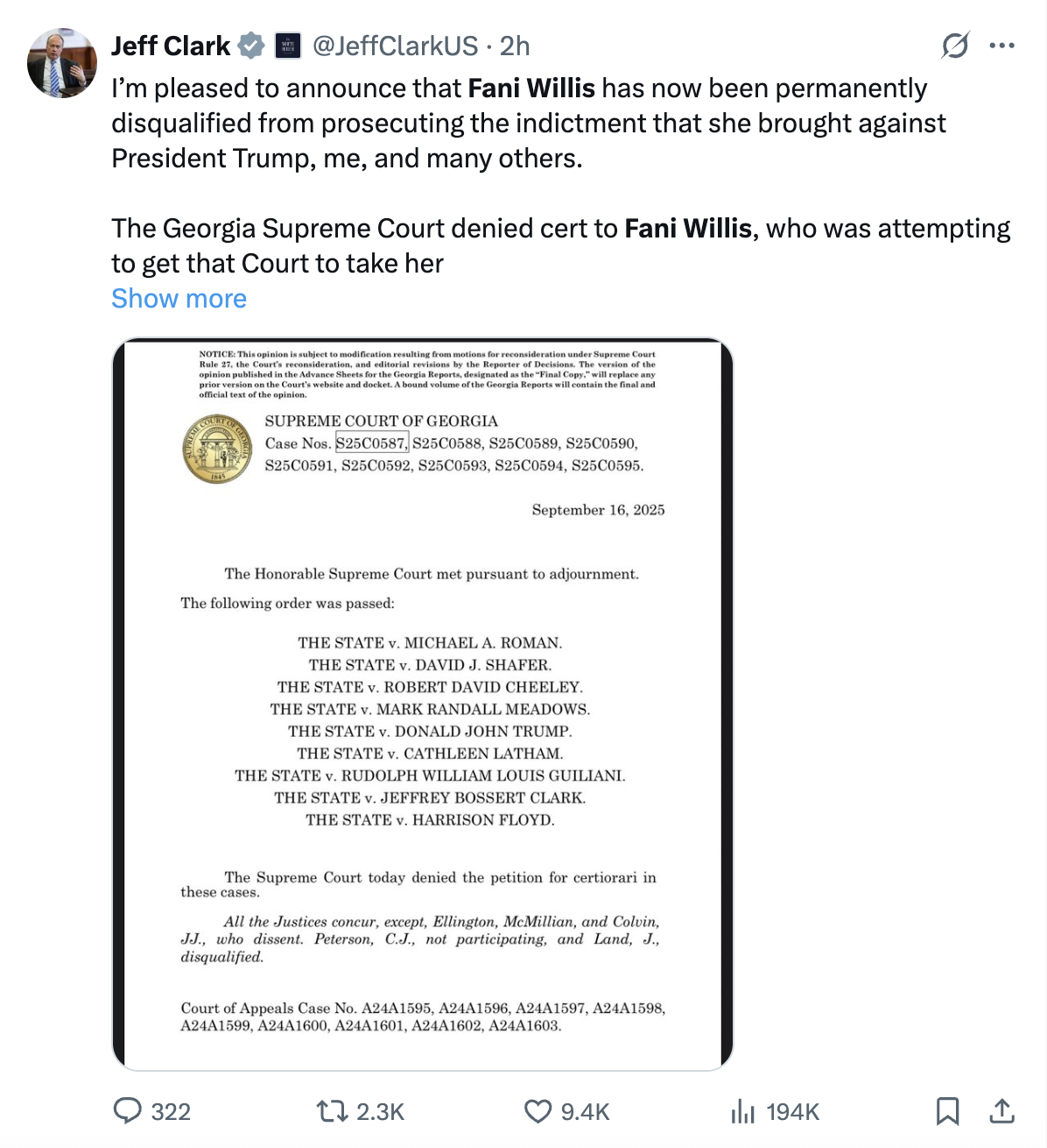 “Willis’ misconduct during the investigation and prosecution of President Trump was egregious and she deserved nothing less than disqualification. This proper decision should bring an end to the wrongful political, lawfare persecutions of the President,” Sadow said.