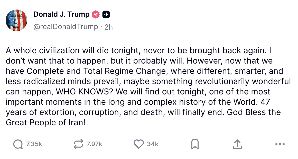 Trump, posting on Truth Social, doubled down on his warning. “A whole civilization will die tonight,” he wrote, before adding, “Now that we have Complete and Total Regime Change, where different, smarter, and less radicalized minds prevail, maybe something revolutionarily wonderful can happen, WHO KNOWS?”